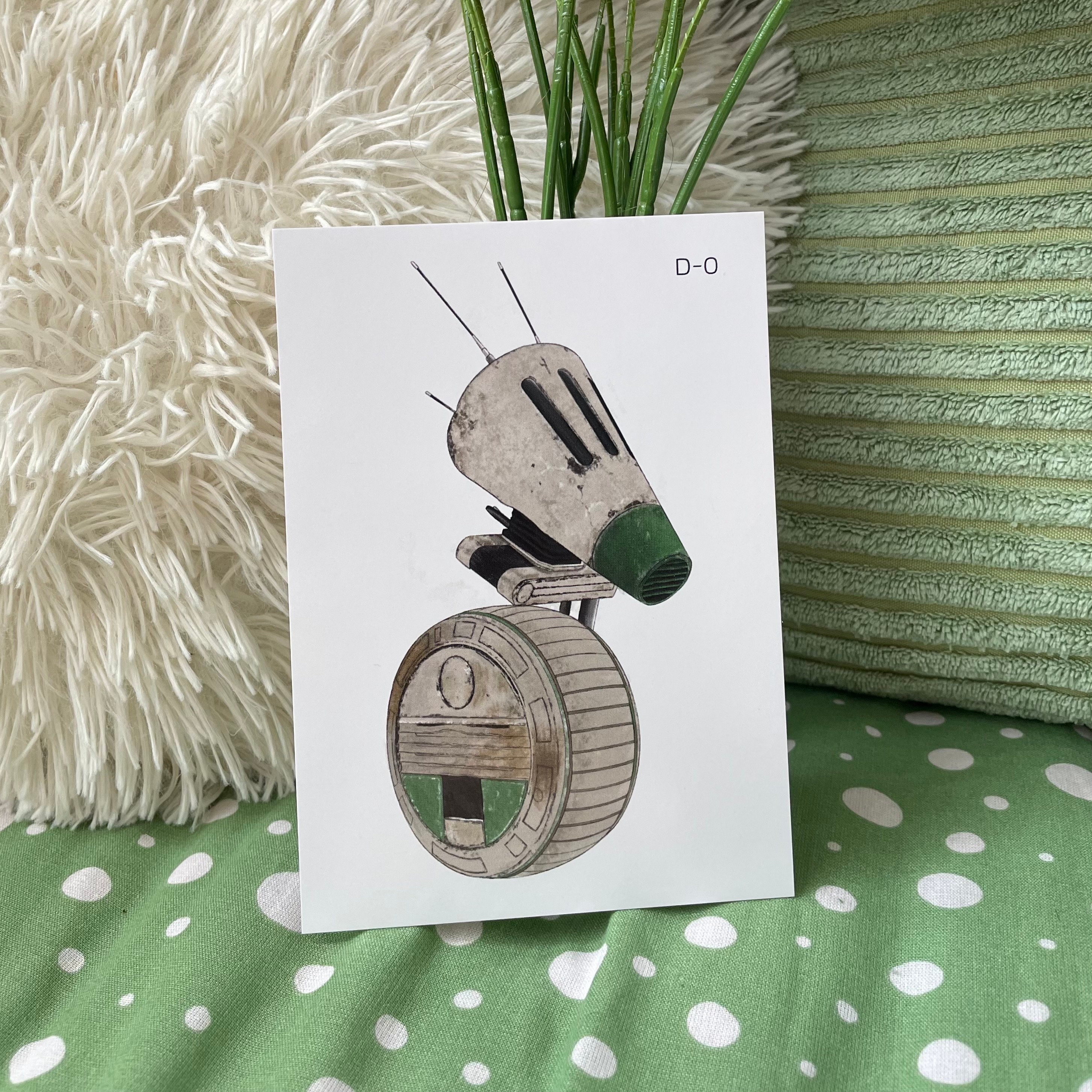 A6 art print of D-O droid from Star Wars sequels. Illustrated by Chloe Penn Illustration. Printed on standard A6 glossy paper.