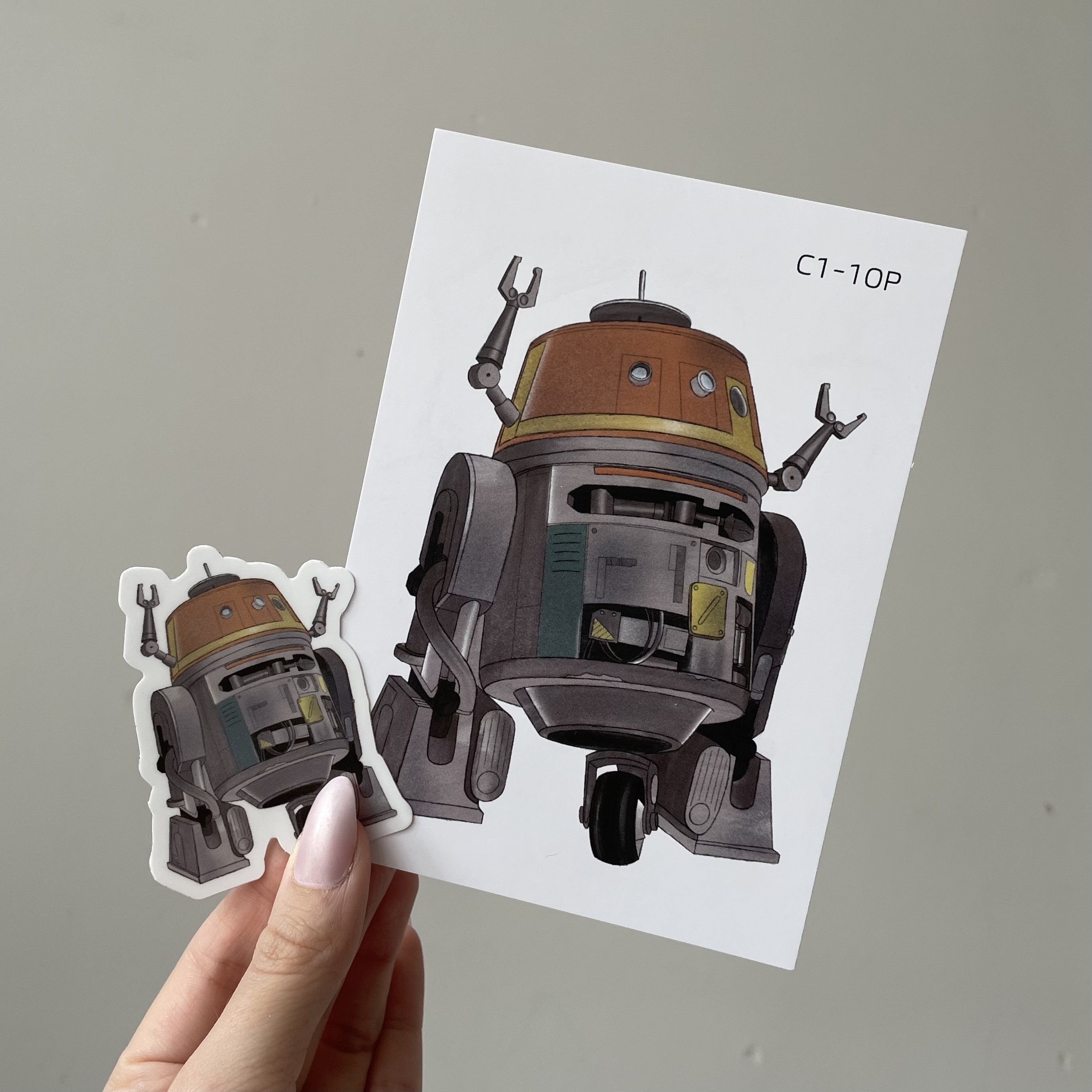 *Bundle* A6 art print and 7cm die-cut sticker of Chopper/C1-10p droid from Star Wars Rebels. Illustrated by Chloe Penn Illustration. Print printed on standard A6 matte paper.Sticker suitable for laptops, furniture and interior surfaces.