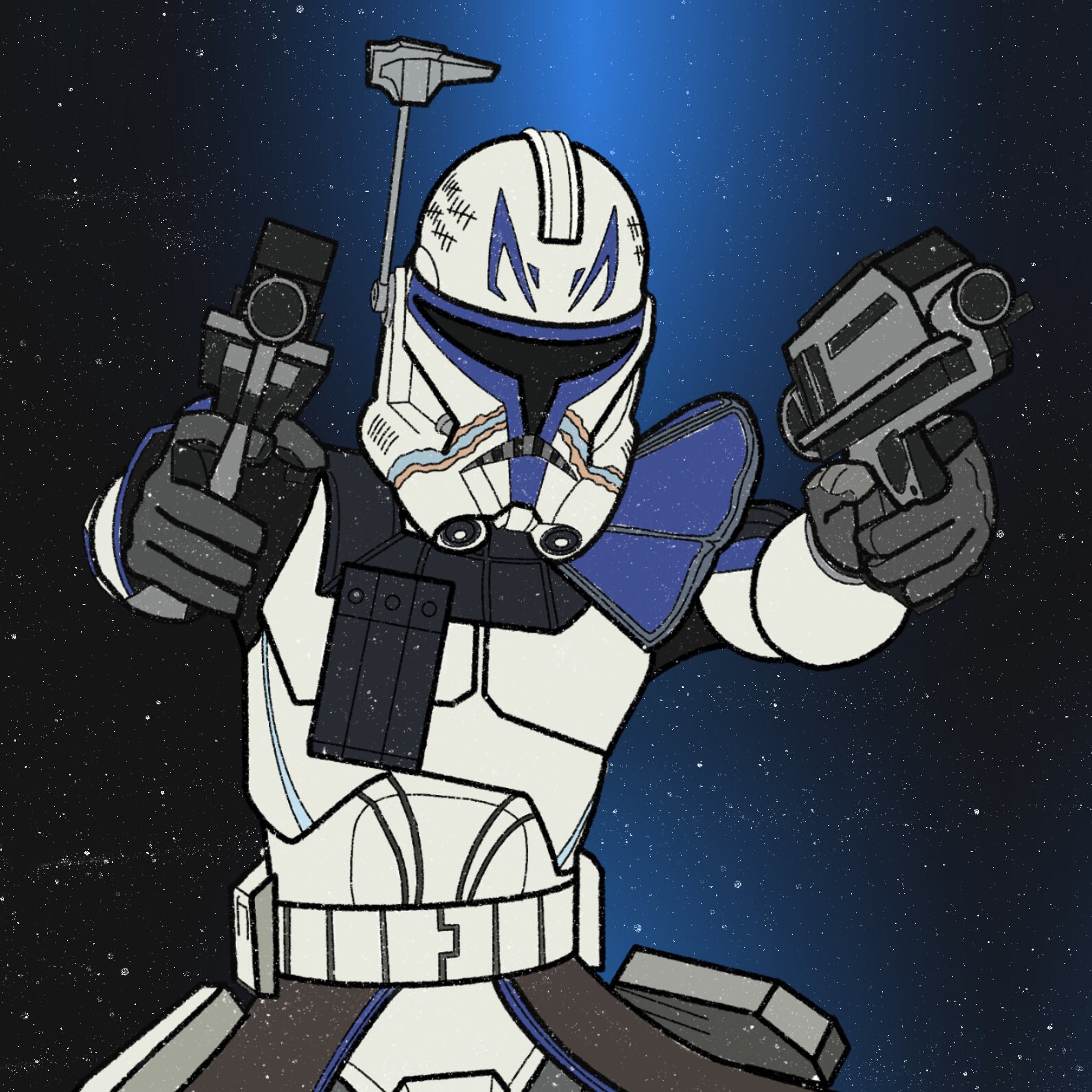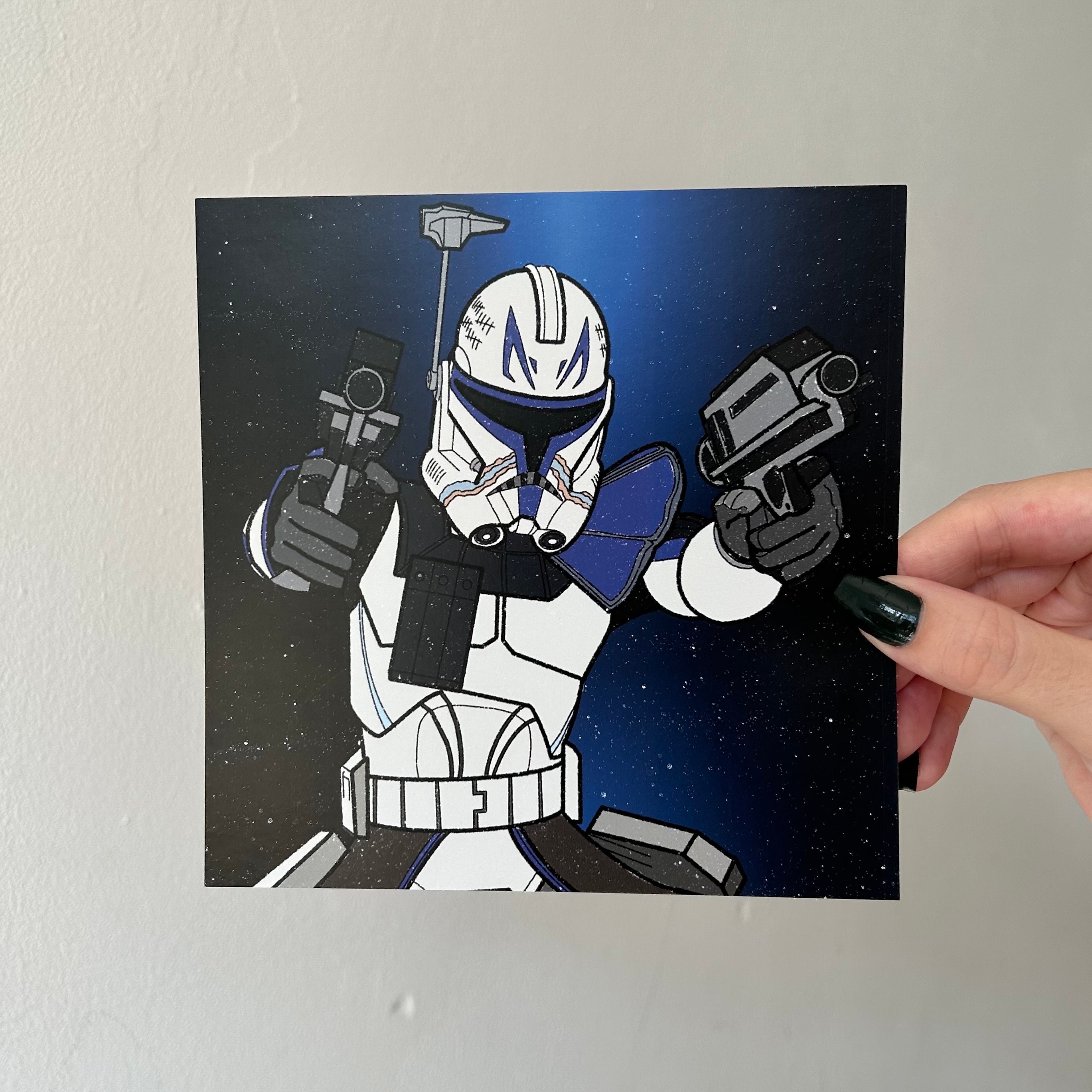 15x15cm square art print of Rex from The Clone Wars. Illustrated by Chloe Penn Illustration. Printed on standard matte paper.