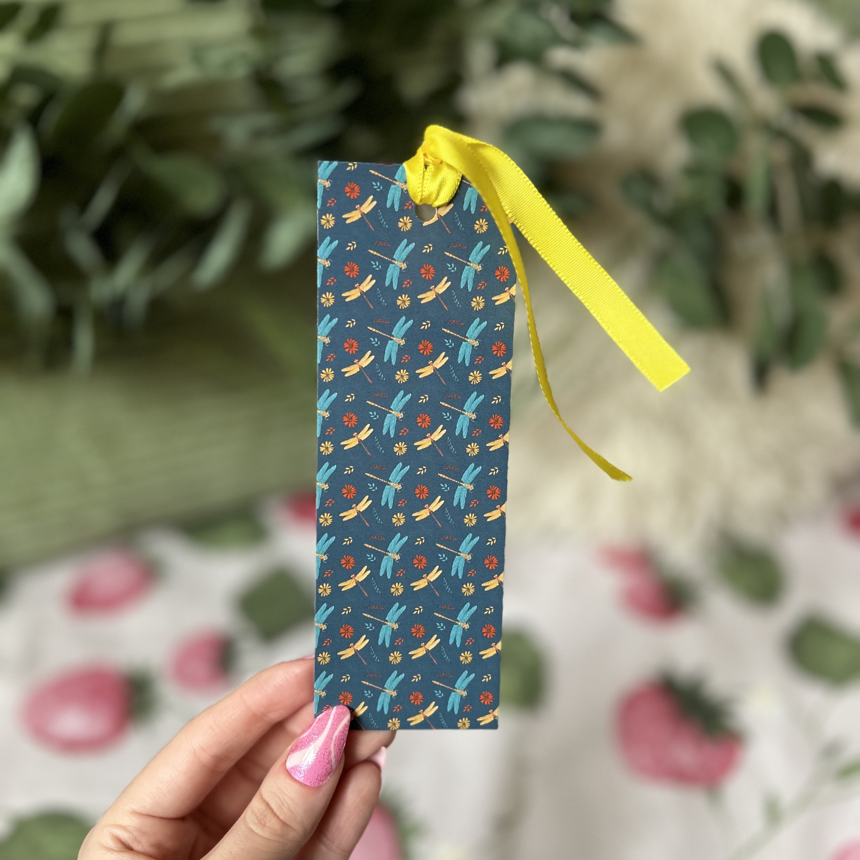 Dragonfly floral bookmark.5cm x 15cm Bookmark.Insect, bug, nature inspired whimsical design with navy blue, yellow, red, and light blue.Illustrated by Chloe Penn Illustration. Printed on both sides on standard glossy paper with yellow ribbon.