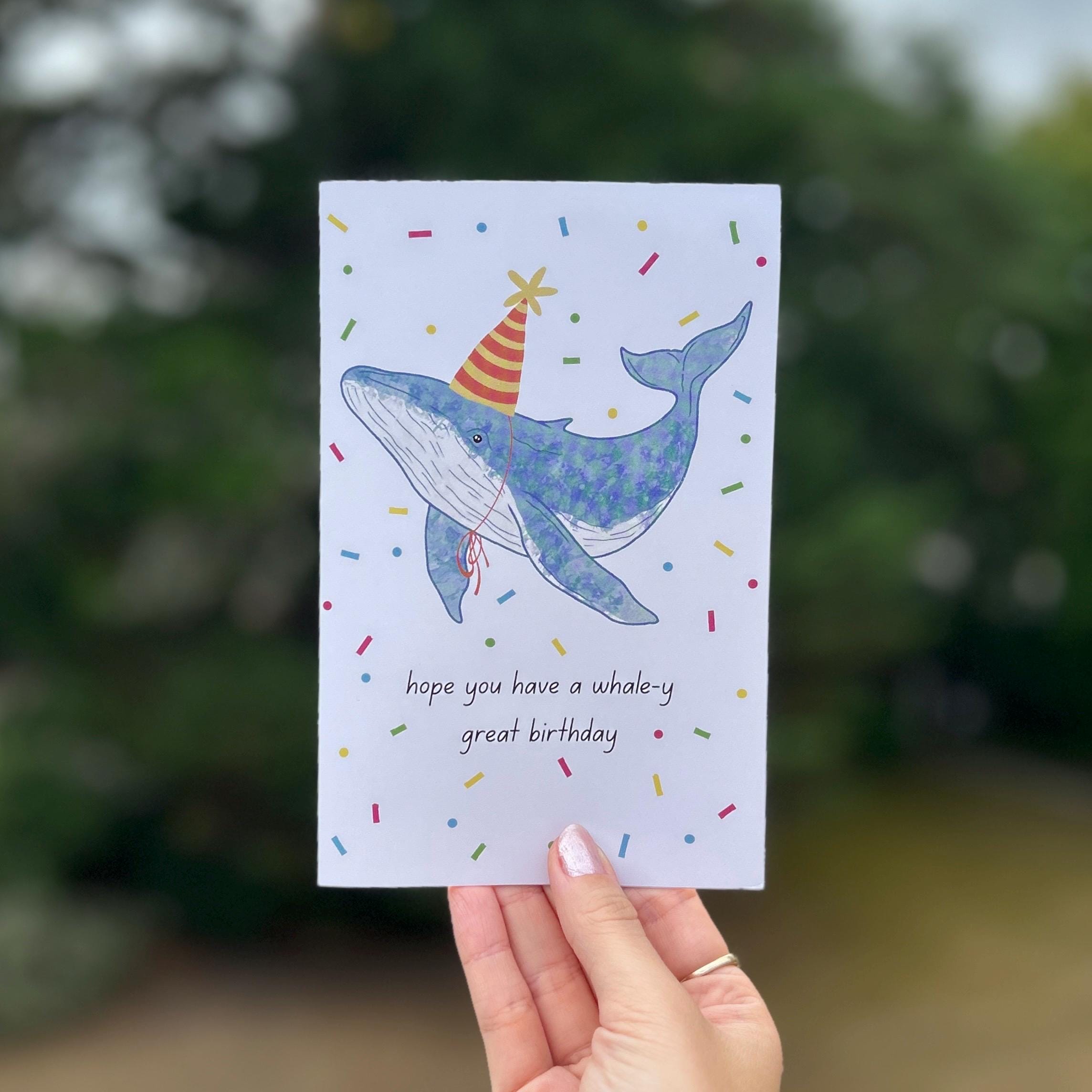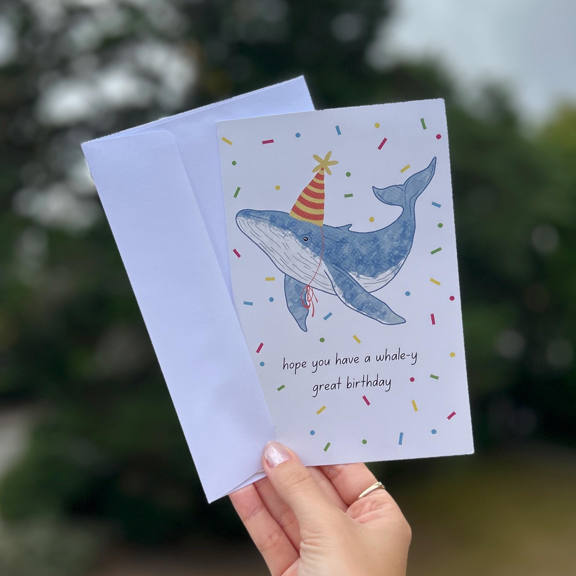 Blue Whale Birthday greetings card - “Hope you have a whale-y great Birthday”18.2 x 11.7 cmWhite envelope included Blank inside for you to add your own message Designed by Chloe Penn Illustration