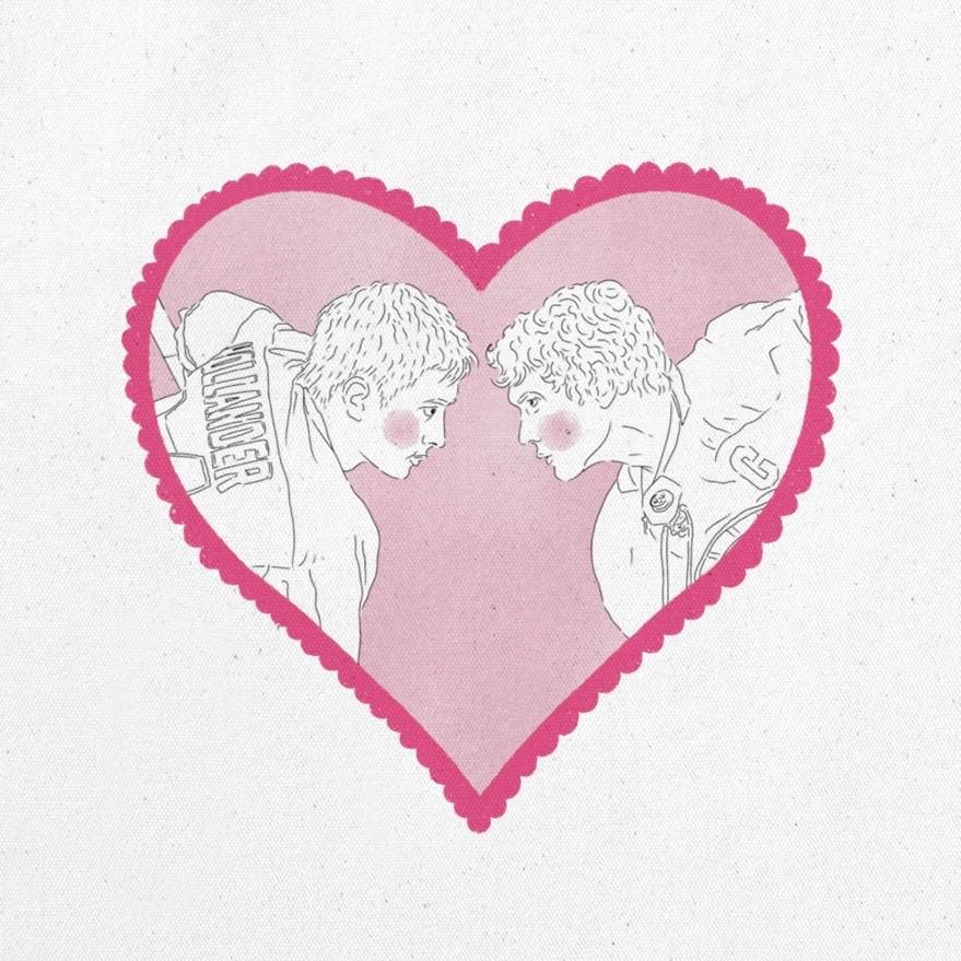 100% cotton white fabric tote bag featuring Shane Hollander (Hudson Williams) and Ilya Rozanov (Connor Storrie) from the queer hockey romance book and TV series Heated Rivalry by Rachel Reid.
