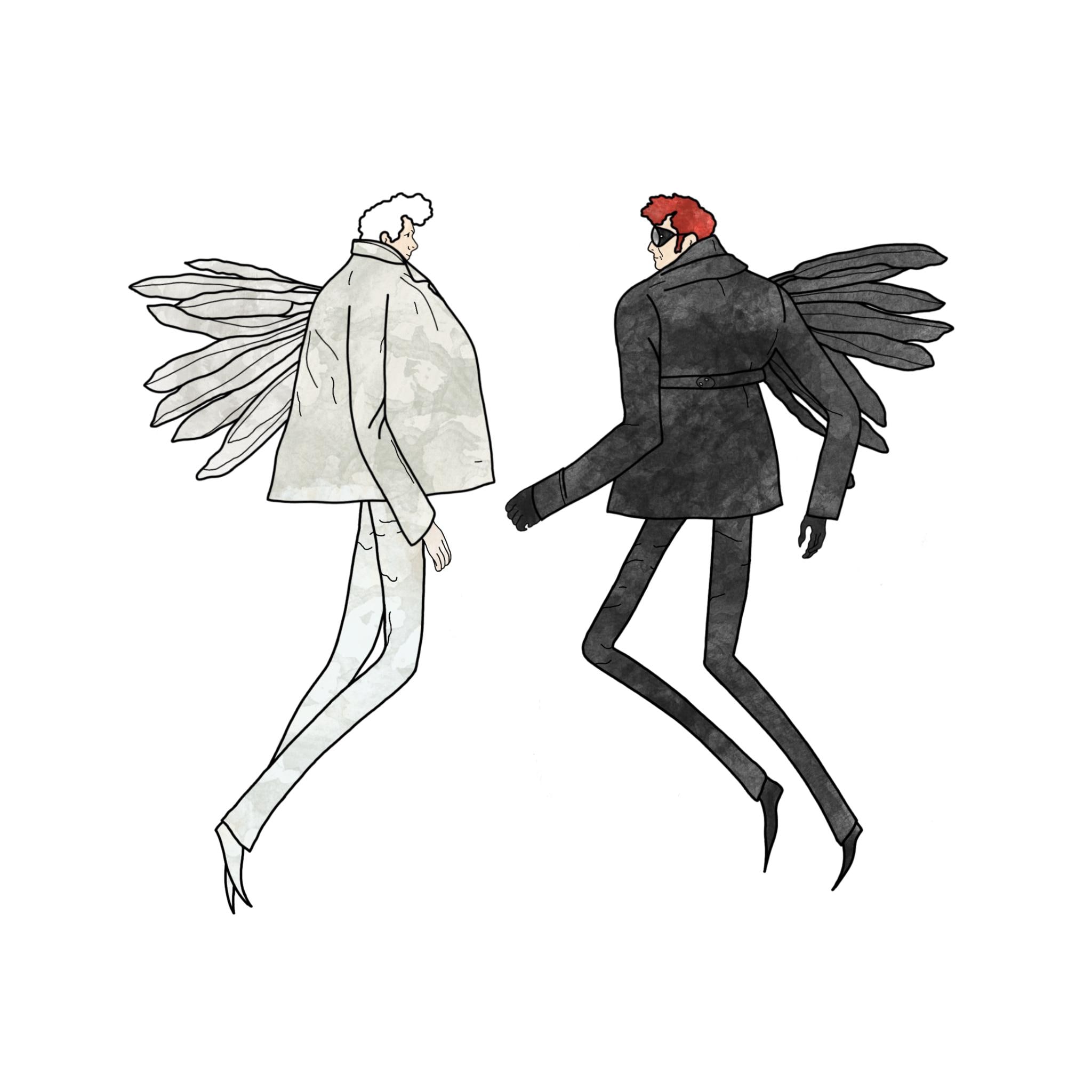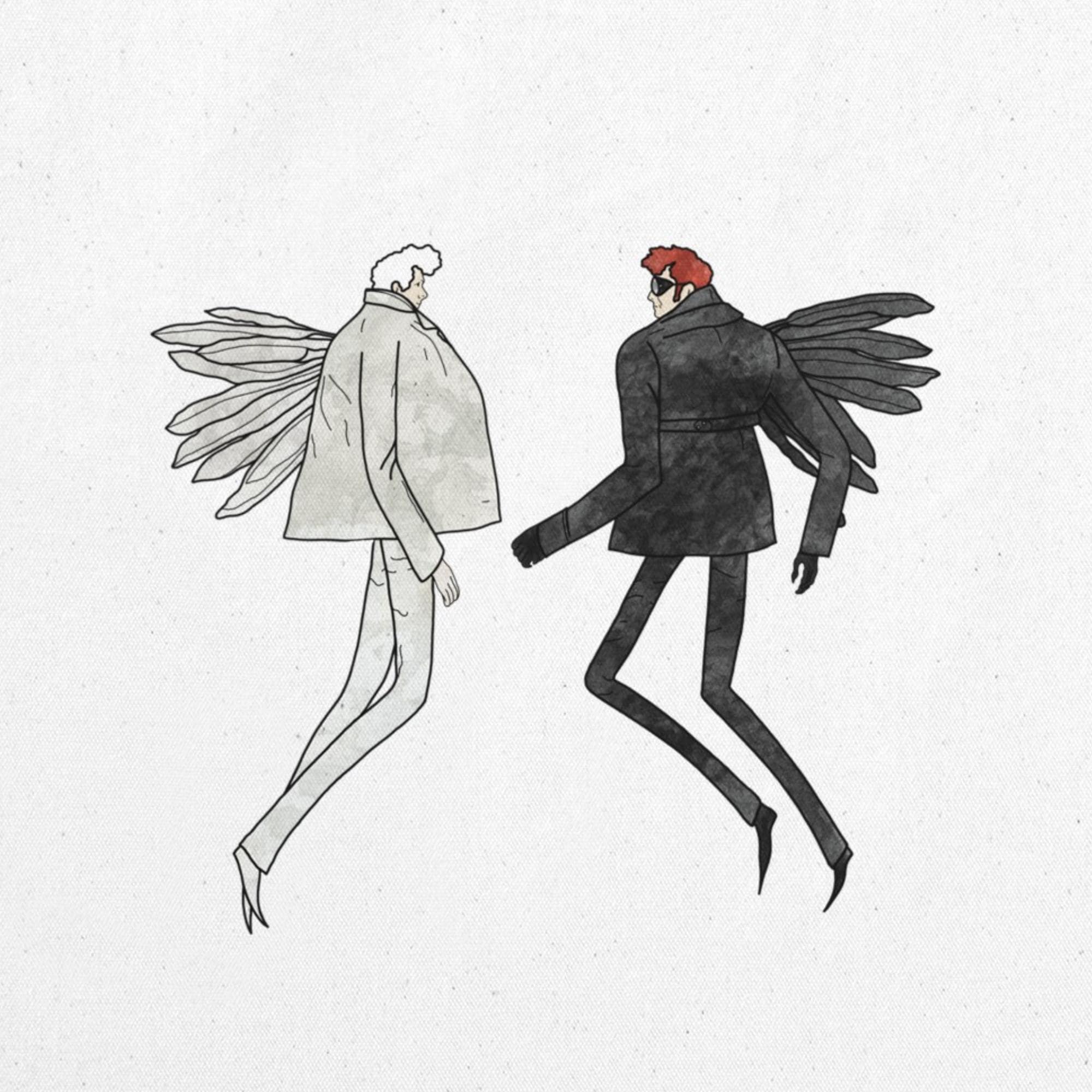 100% cotton fabric tote bag featuring illustrated print of Aziraphale and Crowley from the Tv show & books Good Omens.